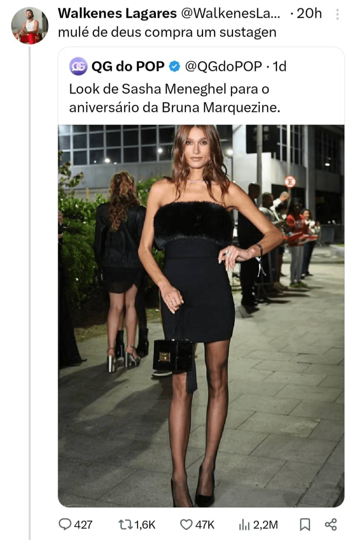 O cantor João Lucas, marido de Sasha Meneghel, saiu em defesa da esposa após ela ser alvo de críticas nas redes sociais por conta de sua magreza. Sasha chamou atenção ao usar um look ousado na festa de 30 anos da atriz Bruna Marquezine, o que gerou comentários negativos sobre sua aparência física. Um dos internautas chegou a sugerir que ela tomasse suplementos alimentares, ao que João respondeu de forma contundente, afirmando que a esposa é “gata, feliz, gostosa e saudável”.