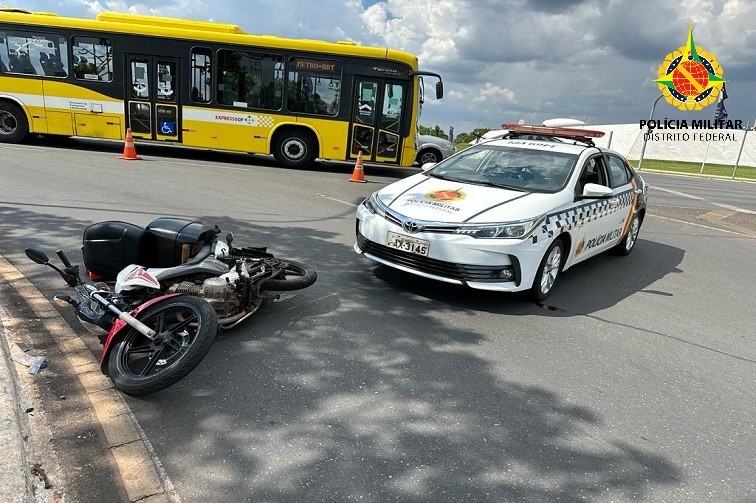 Um motociclista imprudente colidiu com uma viatura do Batalhão de Policiamento de Trânsito (BPTran), na Via S1 próximo ao memorial JK no eixo monumental, por volta das 14h00 deste sábado (07).