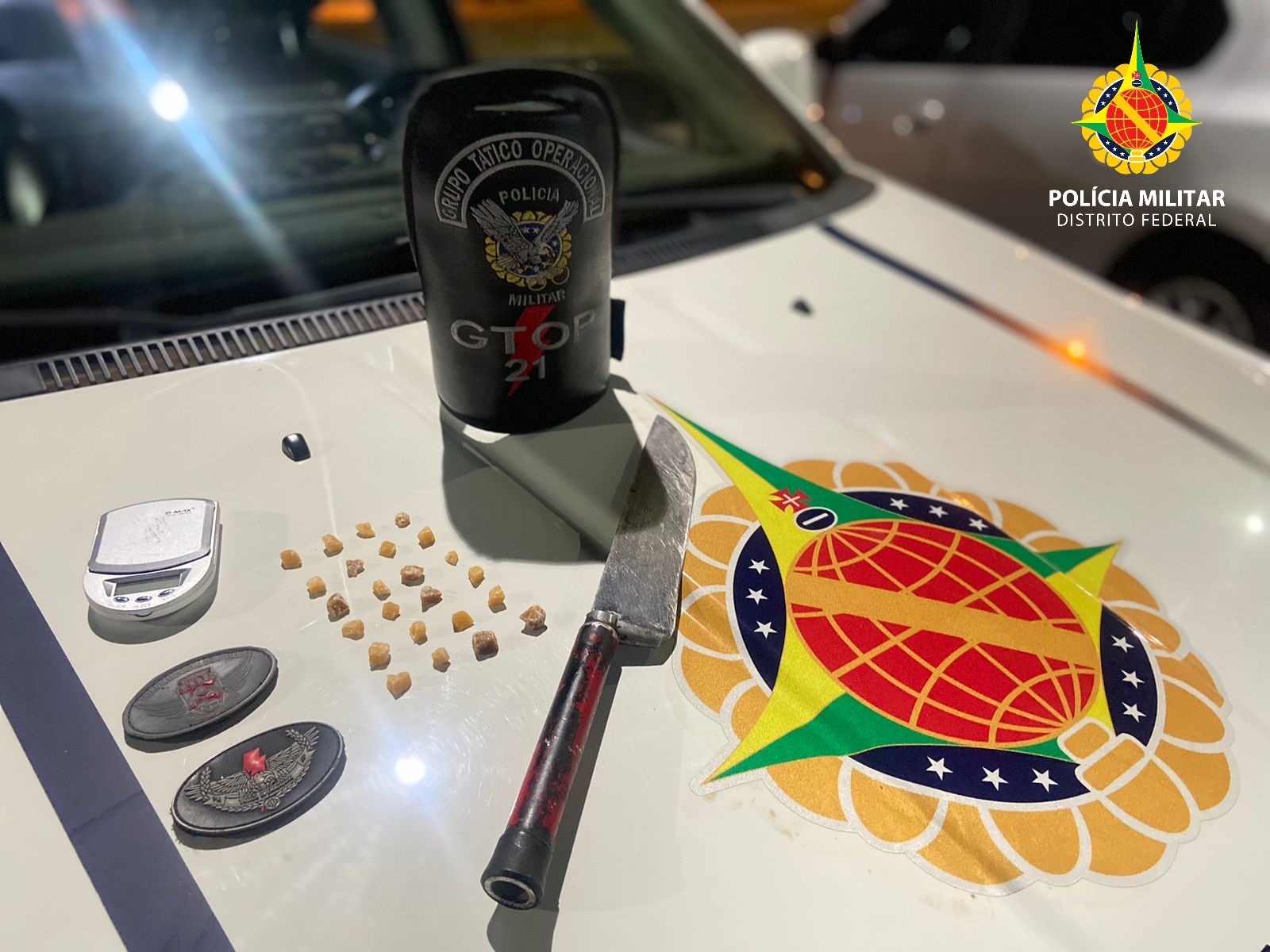 Foram 24 pedras de crack e 01 balança de precisão caracterizando um possível envolvimento com tráfico de entorpecentes, bem como uma faca. Os itens apreendidos foram recolhidos como parte da evidência para investigação do caso pela PCDF.