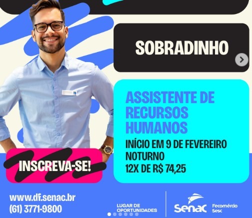 O Senac-DF abriu inscrições para cursos profissionalizantes com início em 9 de fevereiro, distribuídos em diferentes regiões do Distrito Federal. As opções abrangem áreas como administração, recursos humanos, beleza, gastronomia, saúde e desenvolvimento pessoal. Os cursos oferecem turnos variados e descontos de 10% nas mensalidades.
