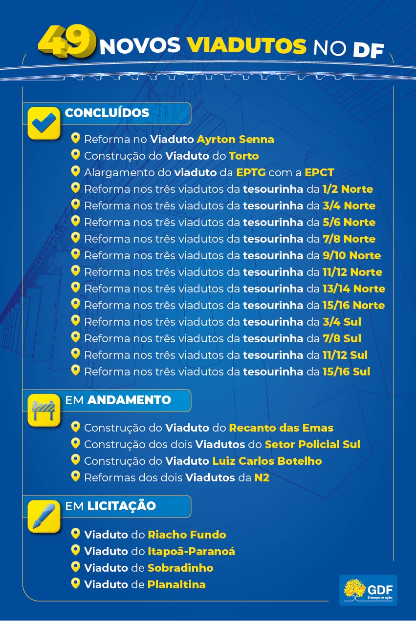 O viaduto da Epig, que se chamará Luiz Carlos Botelho, é um dos 49 que estão em construção, manutenção ou que o GDF já entregou desde 2019. O investimento nessas obras, até agora, é de aproximadamente R$ 280 milhões. Isso mostra o compromisso deste governo em trabalhar para garantir mais segurança, conforto e agilidade para os motoristas que trafegam pela região, diariamente.